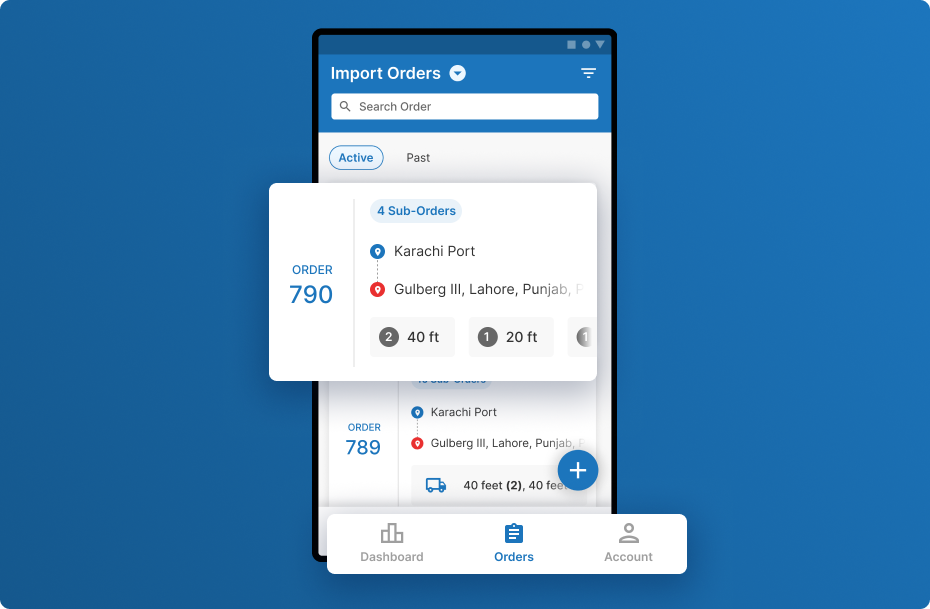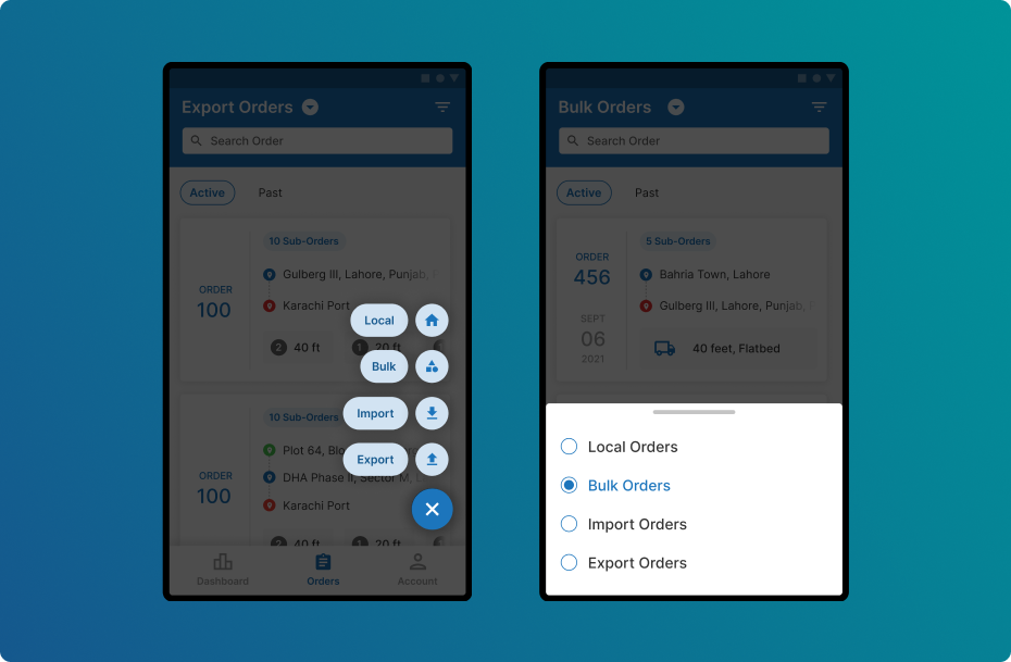 Order Creation: The floating “+” button enables order creation in just two taps, revealing four types: local, bulk, import, and export, for a streamlined experience.