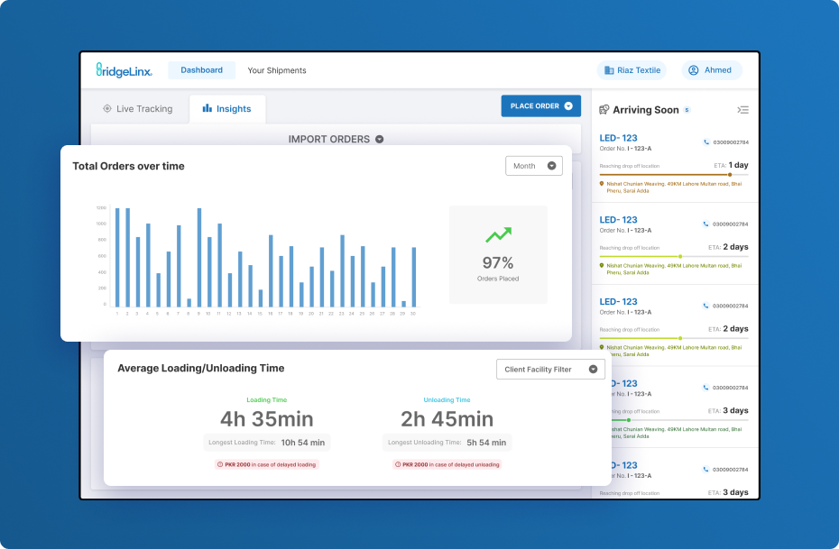 - Average Loading/Unloading Time: Highlights time efficiency and cost impact, with filters by facility for deeper analysis.