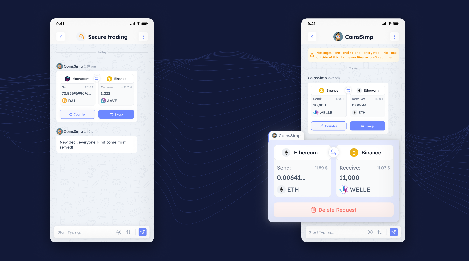 Users can create chat rooms to negotiate trades, post offers, and reply with counter-offers in a seamless conversational format. The trading interface includes live order books, swap flows, and portfolio management dashboards. Users can perform NFT-to-NFT, NFT-to-ERC-20, and ERC-1155 P2P swaps. UX research, wireframes, and prototypes ensured all actions are intuitive, from first login to executing advanced trades.